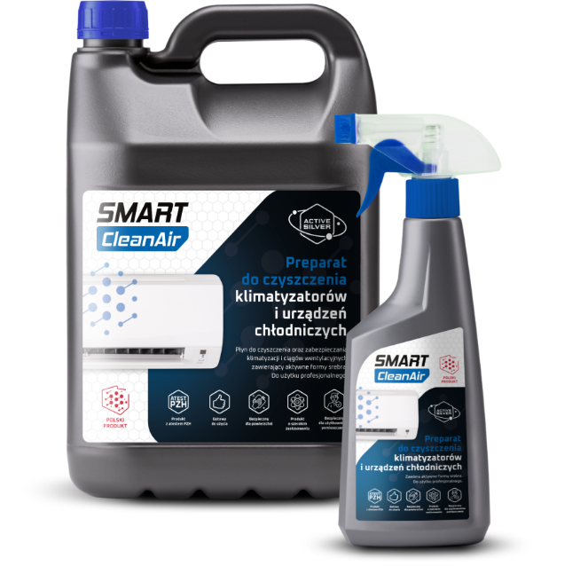 Smart CleanAir is a modern product for cleaning air conditioning systems and cooling equipment, with a formula based on active forms of silver, for professional use. The silver contained in the product ensures long-lasting protection against the development of pathogenic microorganisms, reduces the number of microbes, including Legionella, and eliminates foul odors. Following the formula’s application, a high level of hygiene and purity is maintained in HVAC systems. Effectively removes dirt, dust and sediments. The product does not cause corrosion and can be used on plastic, metal, ceramic, glass, and aluminum surfaces as well as on lacquered surfaces.