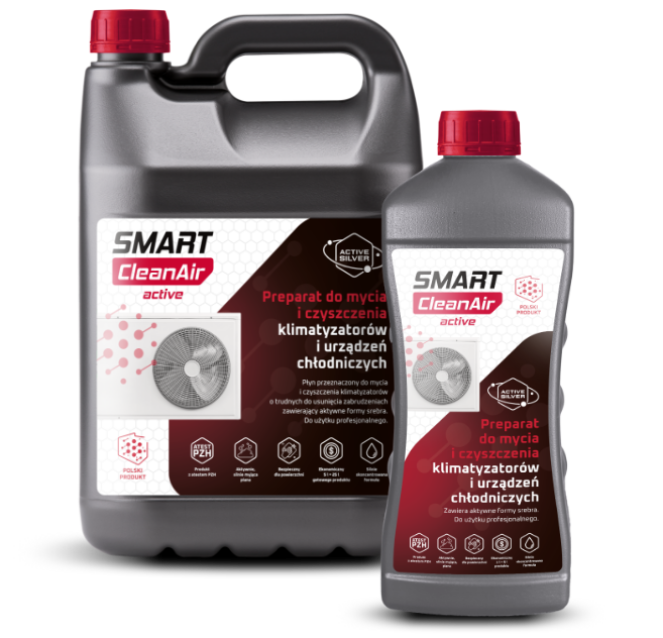 Smart CleanAir Active is a modern, concentrated formula for washing and cleaning of dirty outdoor air conditioning systems, and thanks to the application of high-strength active foam, it effectively removes even the most resistant pollution. Effectively removes dirt, dust, sediments, pollution from petroleum derivatives and fats. The silver contained in the formula ensures long-term reduction of microbes. The formula is based on surfactants. Following the formula’s application, a high level of hygiene and purity is maintained in HVAC systems. It is safe for lacquered surfaces, plastics, metals, ceramics and aluminum. It does not contain caustic acids or bases, does not cause corrosion.