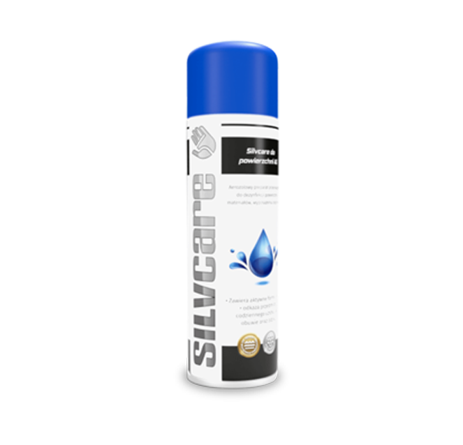 SILVCARE dezynfekcja powierzchni Ag to produkt w postaci aerozolu przeznaczony do dezynfekcji powierzchni, materiałów, wyposażenia oraz mebli. Zawiera wysokie stężenie alkoholu (>70% ). Obecne w składzie nanocząstki srebra wspierają ochronę mikrobiologiczną, zapewniając długotrwałe działanie na dezynfekowanej powierzchni.